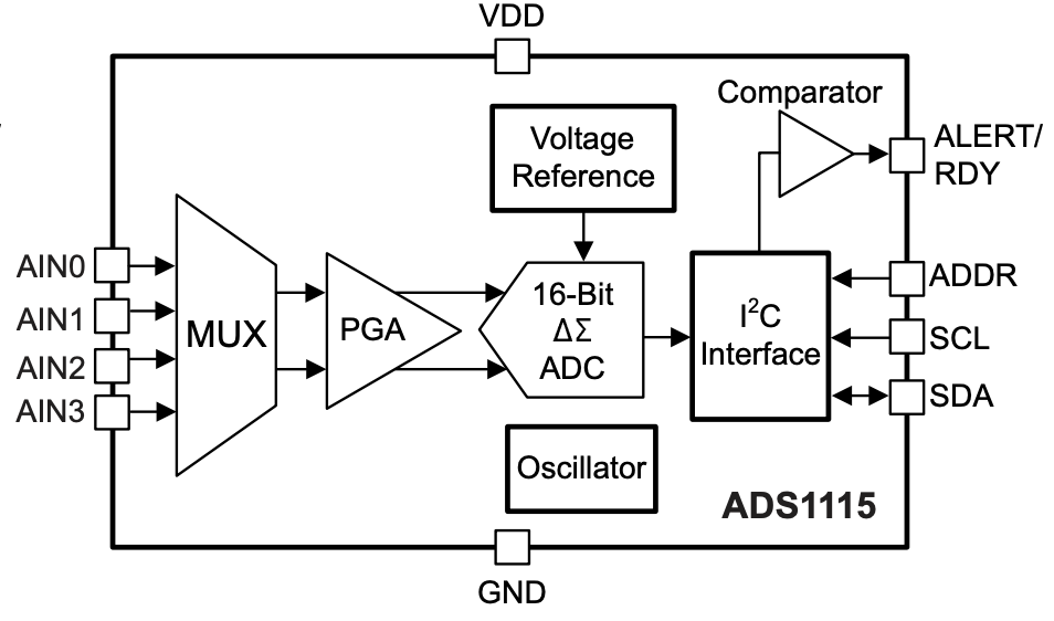 Figure 4.4 illustrates the functional block diagram of the ADS1115 Analog-to-Digital Converter. The ADC features a multiplexer (MUX) that allows for the selection between multiple input channels, followed by a programmable gain amplifier (PGA). The 16-bit delta-sigma ADC performs high-resolution conversion of the input signal. An internal voltage reference, oscillator, and I²C interface facilitate accurate conversion and communication with external devices. The comparator and ALERT/RDY functionality provide additional flexibility for system integration.