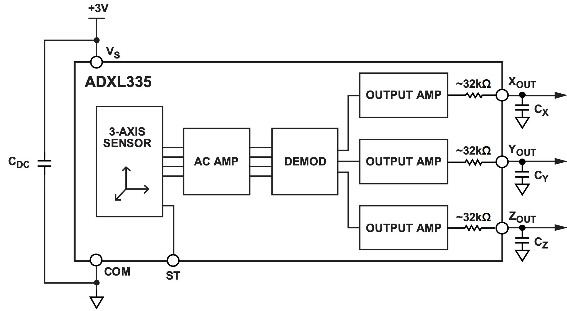 Figure 4.3 presents the internal block diagram of the ADXL335 accelerometer. It consists of a three-axis MEMS sensor, followed by an AC amplifier and demodulator stage. Each axis output is then buffered through separate output amplifiers, providing analog voltage signals corresponding to acceleration along the X, Y, and Z axes. These outputs are routed to external filtering components to stabilize the signal.