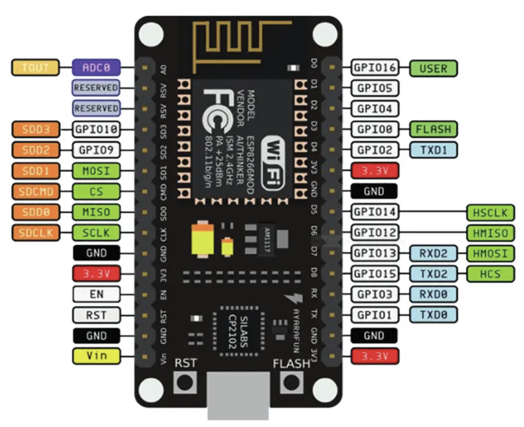 Finally, Figure 7.5 displays the ESP8266 microcontroller module pinout. This microcontroller includes GPIO pins, I²C and SPI communication interfaces, and a built-in Wi-Fi module. The diagram highlights the various available digital interfaces for connecting to peripheral devices, as well as power and ground connections necessary for integration into the system. The ESP8266 is responsible for receiving the digital data from the ADS1115 and handling subsequent processing and wireless communication.