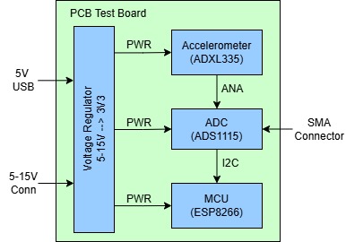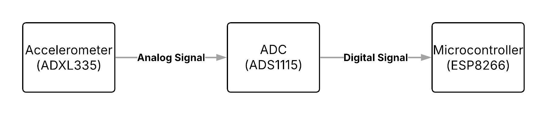 The high-level architecture of the described measurement system is illustrated in Figure 4.2 below. It shows the data flow from the analog accelerometer (ADXL335), through the analog-to-digital converter (ADS1115), and finally to the digital microcontroller (ESP8266) for further processing and communication.