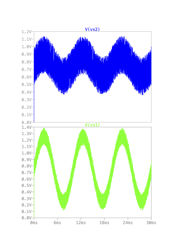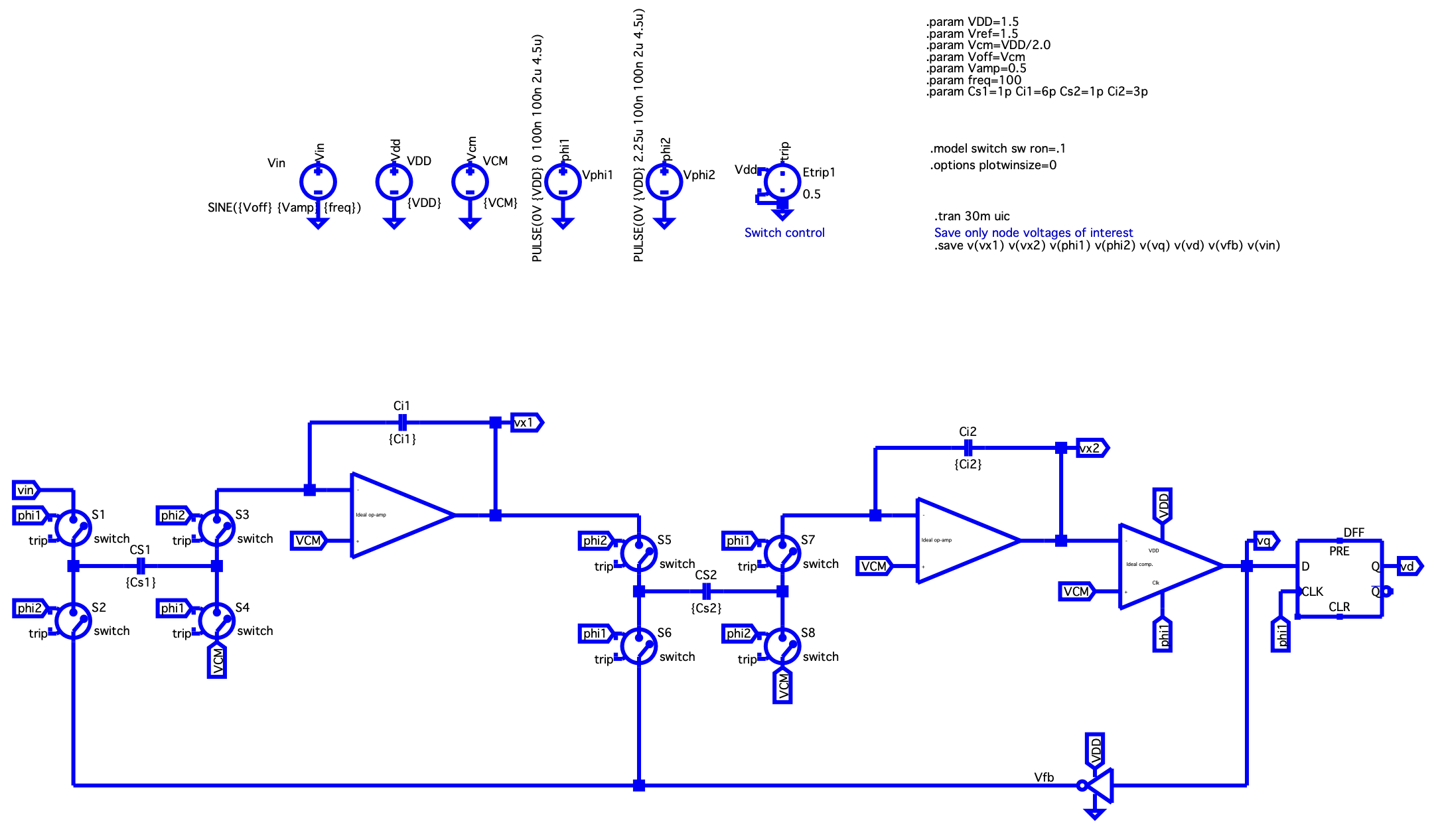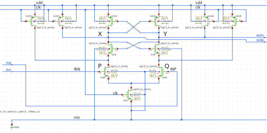 Another important subcircuit is the clocked comparator. The output of our integrator is fed into the comparator and being compared to eiter half of the supply voltage \(V_{DD}\) or to 0 V. After the comparator the voltage signal is now digital (since the comparator only puts our high or low) and this signal is further processed for the feedback with the 1-Bit DAC and the digital filter and decimator.