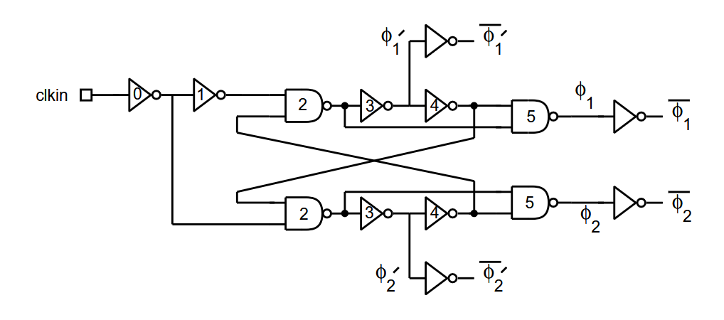 Now assuming we have a clean clocking signal we need to split this clock into two non-overlapping clock signals so the switched-capacitor integrator stage and the other circuit elements can be clocked. Our clock splitter circuit is a circuit based on the given splitter in the lecture number 13 from (Boris Murmann 2024) the lectures of Professor Murmann. This in turn is a circuit designed in the Ph. D. Thesis of Dr. Andrew Abo and utilizes inverters and nand-gates to generate four output signals from the one input clock. These four clock-signals come in pairs of two, so two clock signals which are inverted to each other and then another two signals which have a slightly larger delay (or dead-time) in between them ensuring no overlapping. We implemented this circuit not only using logic gates like the mentioned inverters and nand-gates but also transistorized this circuit.