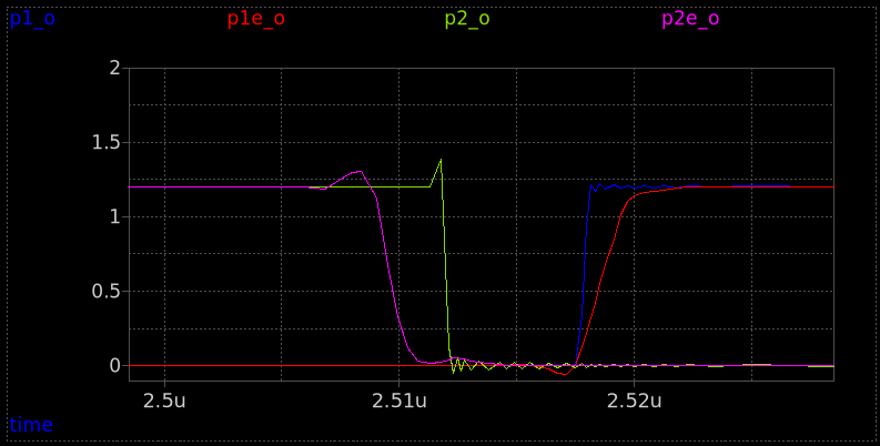 We can see that the clock-signal edges have some overshoot and ringing. This is a point at which the clock splitter circuit should be further optimized.