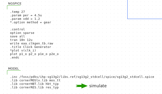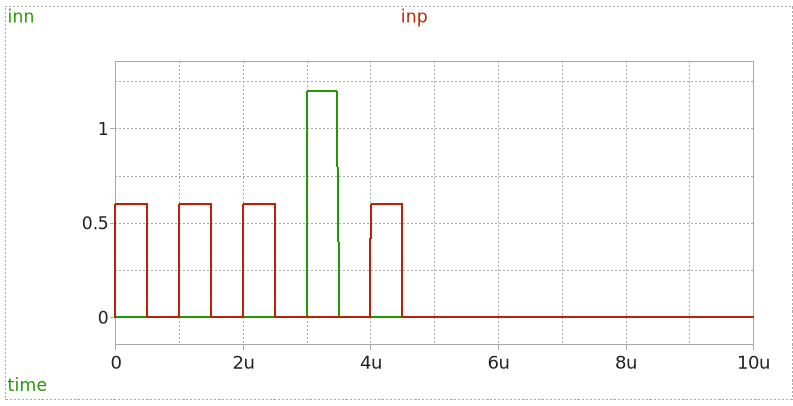 Below you can see the setup for the simulation. The input is fed by a clock signal with a period time of 4.5 \(\mu\) s: