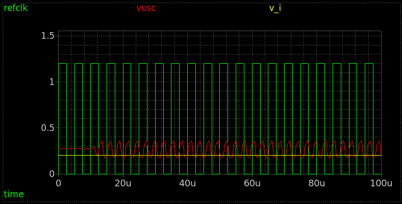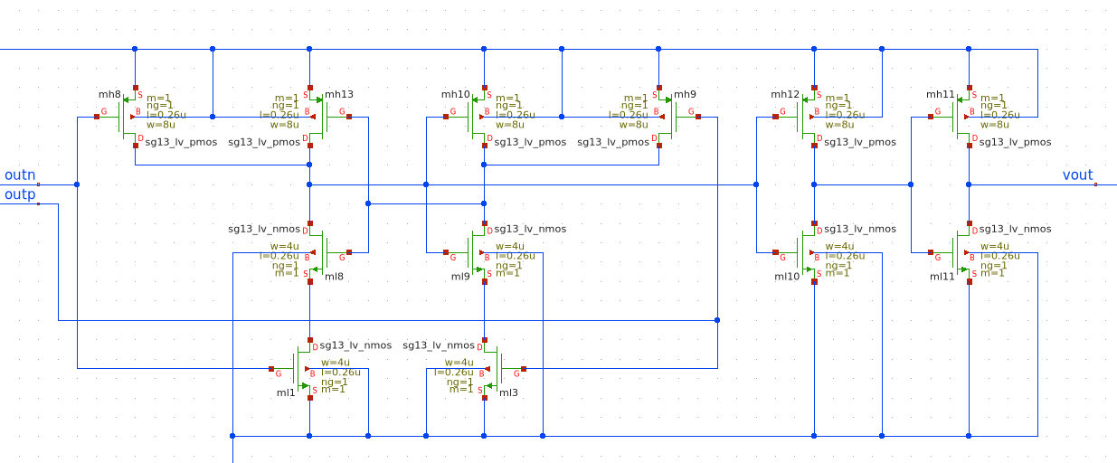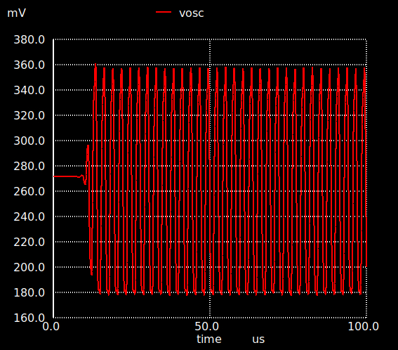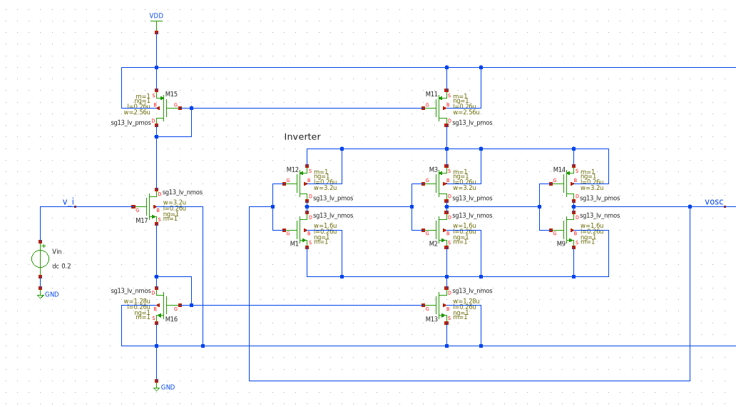 In the middle part of the circuit we can see the three inverter stages. These are supplied by the four MOSFETs at the edges with current which is in turn controlled by the voltage applied to the nmos on the left-hand side (G. Jovanovic and Stamenkovic 2010). After implementing multiple different oscillator circuits this was the one that finally oscillated: