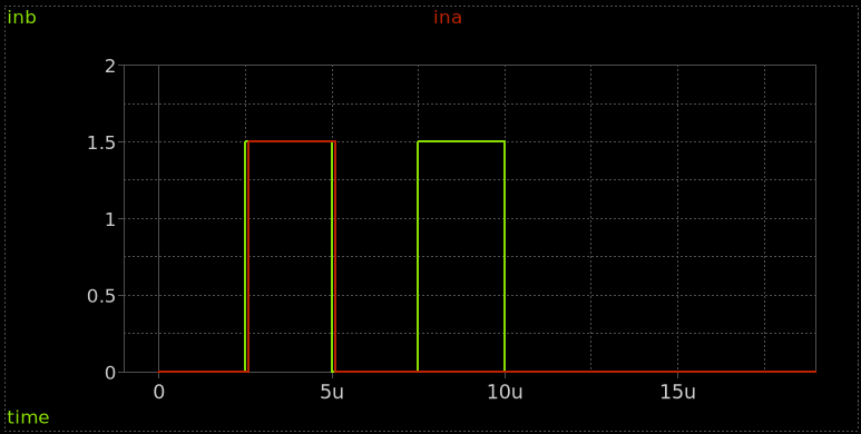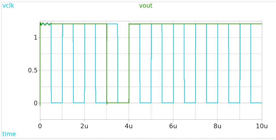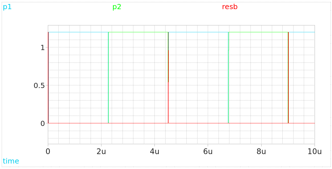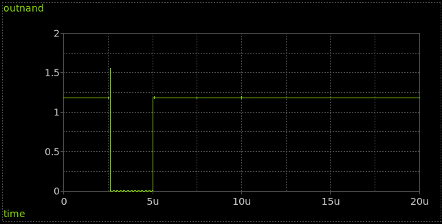 Before continueing with the circuit design we simulated the nand gate to ensure that it operated as we intended. For that we applied clocked signals and checked whether the gate output was low whenever both signal input signals were high and vice versa or not: