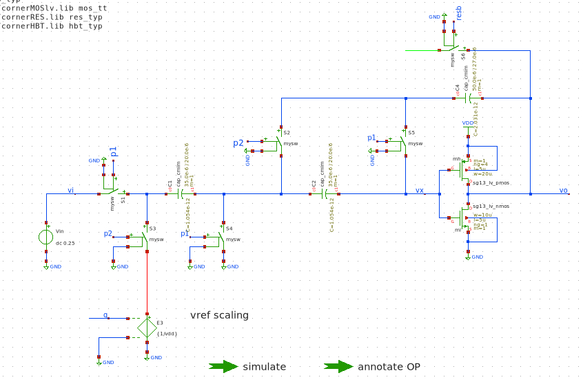 While we could use an operational transconductance amplifier at the heart of our SC-Integrator we implemented an inverter as the core of the integrator. Inverters can be used since the main goal of the integrator stage is to transfer the charge from the sample capacitor \(C_s\) and integrate it with the help of the integration capacitor \(C_i\). For this operation the inverter is enough and we utilize it here. Another drawback with using an OTA or an OpAmp for the integrator is the additional power consumption and area. Additional informations regarding the inverter as an integrator can be found here: (Chae et al. 2011).