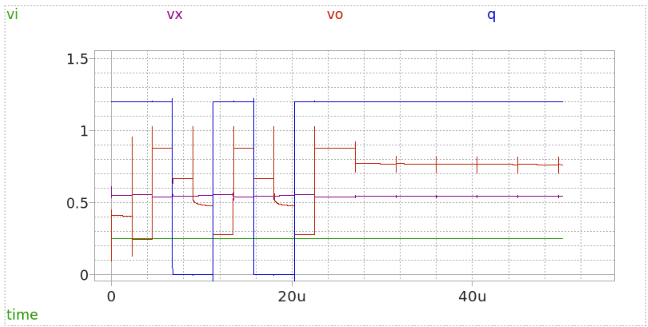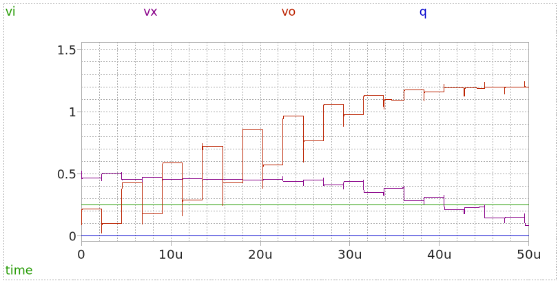 We can see that the voltage after the inverter working as an integrator rises. With the constant input voltage at the input this means that our integrator is indeed working. But the other signals are not correct yet since for example q would need to be a PCM signal.
