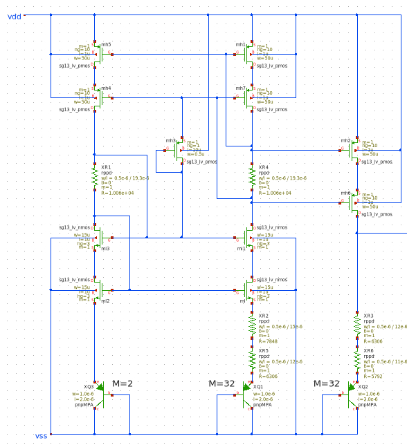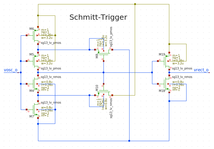 We can see in this plot that after around 10 \(\mu\)s the circuit starts to oscillate. This is a sinusodial oscillation and since we need a rectangular clock signal we implemented a schmitt-trigger circuit after the oscillator in order to get a PWM signal with a duty cycle of 0.5 and a frequency of 222 kHz. The Schmitt-Trigger circuit looks like this (Filanovsky and Baltes 2004):