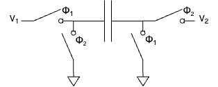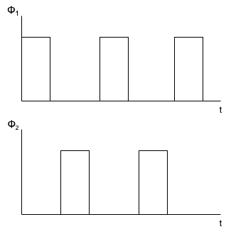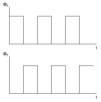 In this Figure we can see three capacitors. Usually we have two capacitors in the SC-Integrator but in this schematic we have a third one. While we know the input capacitor being the sampling capacitor \(C_S\) and the integrating capacitor \(C_I\) the third capacitor after \(C_S\) is the holding capacitor \(C_H\) which holds the charge from the input capacitor for further processing. Also the switches aren’t yet transistorized. But for now lets look at the outputs of this circuit and the clock signals: