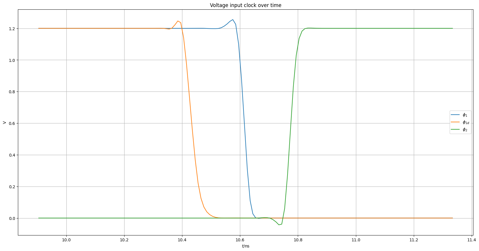Figure 10.2 shows the normal delay between \(\phi_1\) and \(\phi_{1d}\) as well as the non-overlap with \(\phi_2\). The structure used for clock generation was modeled after the circuit provided by (Murmann 2024). In this, they used the sg13g2 standard cells for the NAND gates and inverters which are not built from single transistors and hence their capacitance can not be changed. Simulations with different values for the load capacitances have proven to not impair the structures functionality. We thus continue with this non-transitorized version, since creating the gates from scratch would add unnecessary complexity.