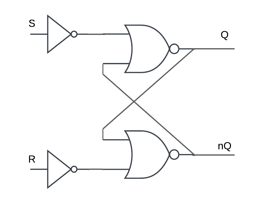 In general, such a latch utilizes two logic gates with 2 inputs and one output each, where one of the inputs will be one of the input signals, while the other will be the fed-back output signal from the respective other logic gate. The provided logic should result in only the Q output or it’s complement nQ to be high, depending.