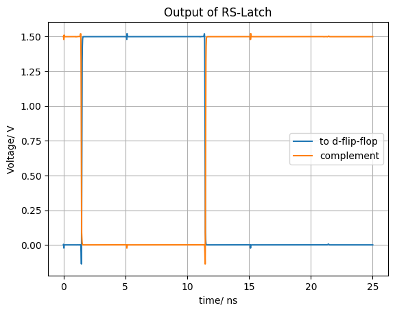 The following plots show the outputs of both the comparator and the cascaded SR-latch. For the first 8 ns, the positive input voltage of the comparator is 1 mV higher than the negative input. At around 8.1 ns, that polarityis reversed.