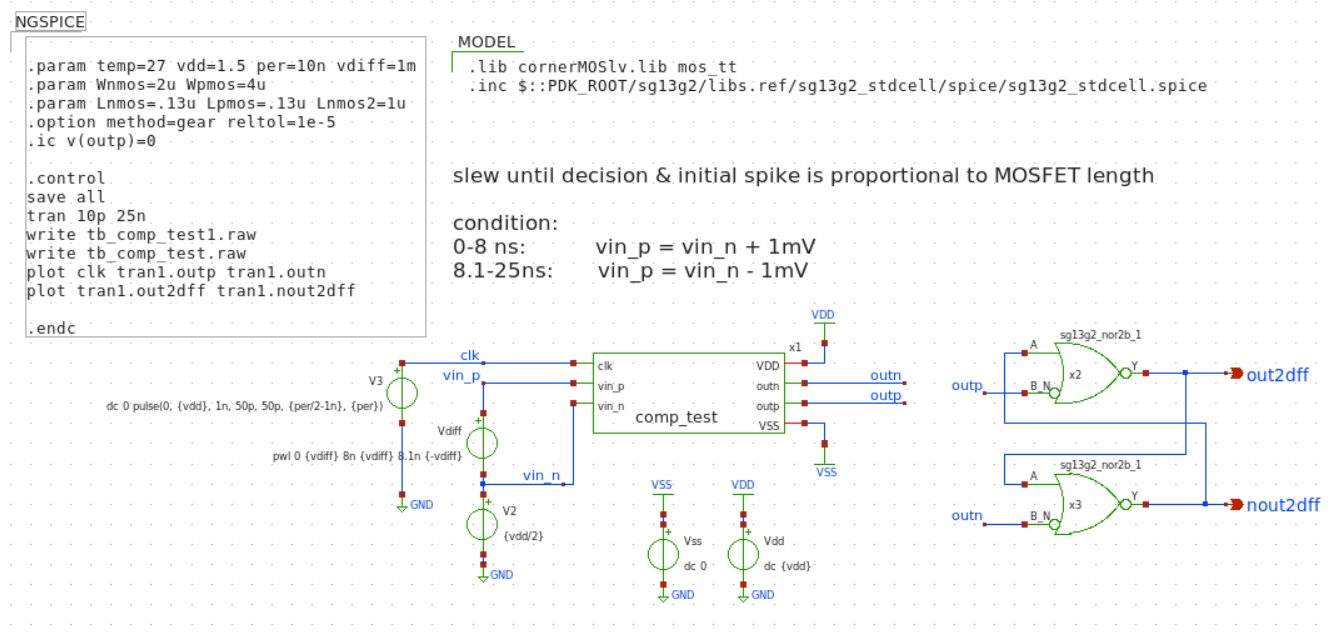 The designs that are considerable as the final results are given within our design directory with “final_working_comp.sch”, “latched_comp.sch” and “latched_comp_dff.sch”, the latter also including a d-flip-flop based on design objects PDK.