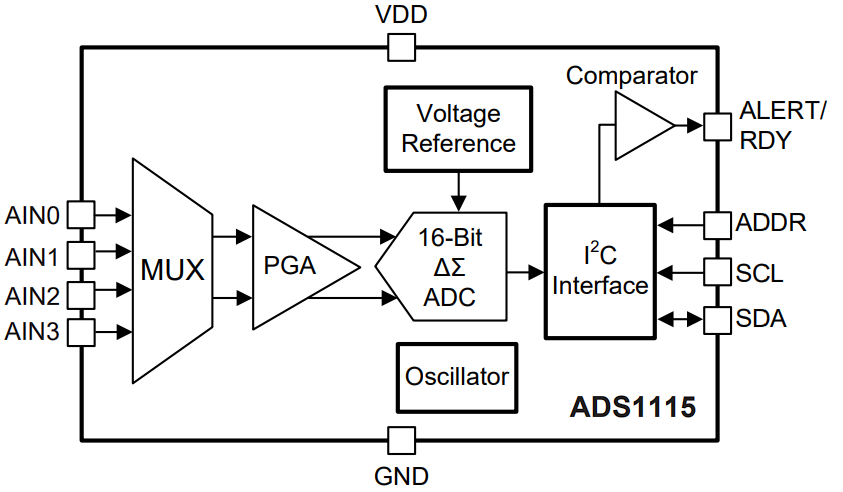 The ADS1115 is a Delta-Sigma ADC which includes various auxillary subsystems, like a multiplexer for the multiple input channels, an input programmable gain amplifier (PGA), an interface section to support the I2C communication protocol, etc.