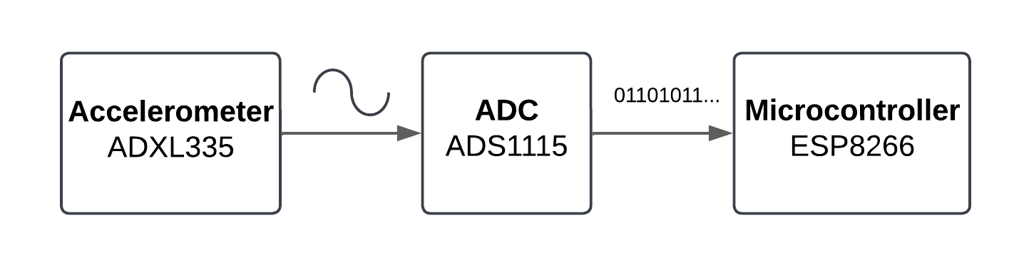The specific board-level components that are considered for this signal-chain are the ADXL335 accelerometer, the ADS1115 ADC and an ESP8266 microcontroller.