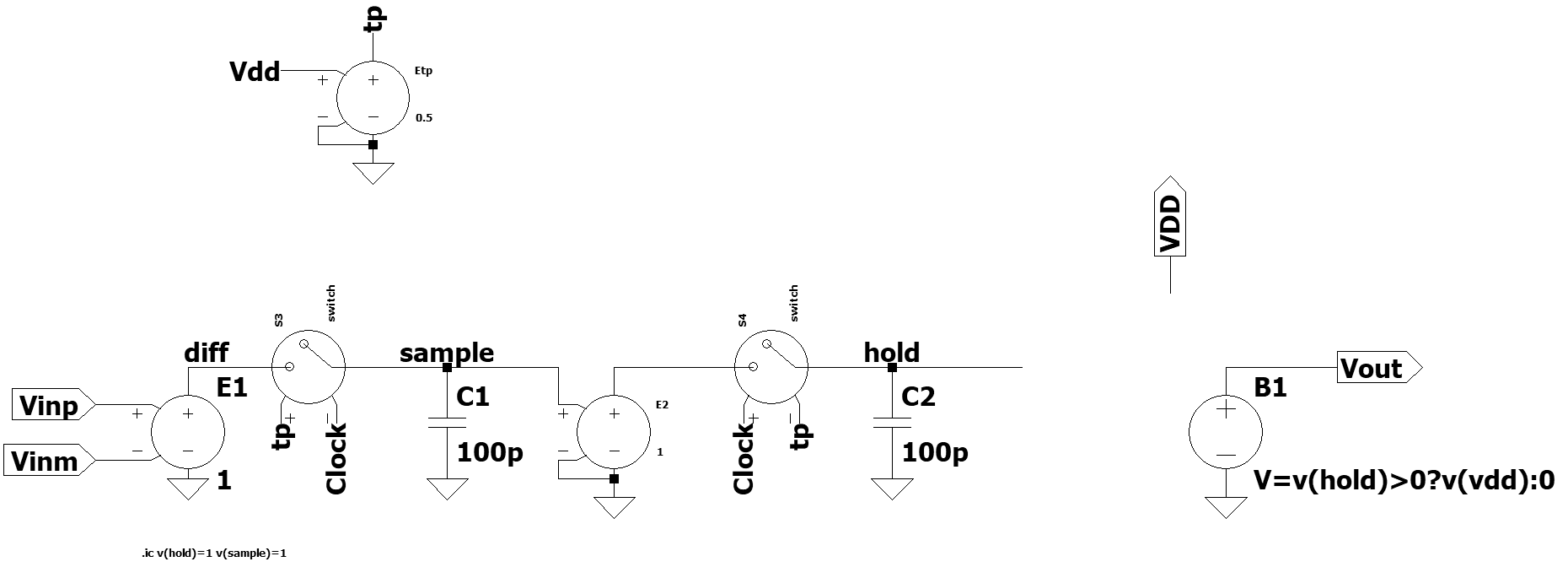 This circuit is proposed by Boris Murmann in his EE628 lecture series (e.g. lec 6, (Murmann 2024)), while he himself adopted the design from the paper given in (Chae and Han 2009). The MOSFET lengths (L) can be chosen minimal (\(\approx\) 130 nm), since almost all of them simply serve as switches, with only those for the inputsignal are choosen with a slightly greater margin.
