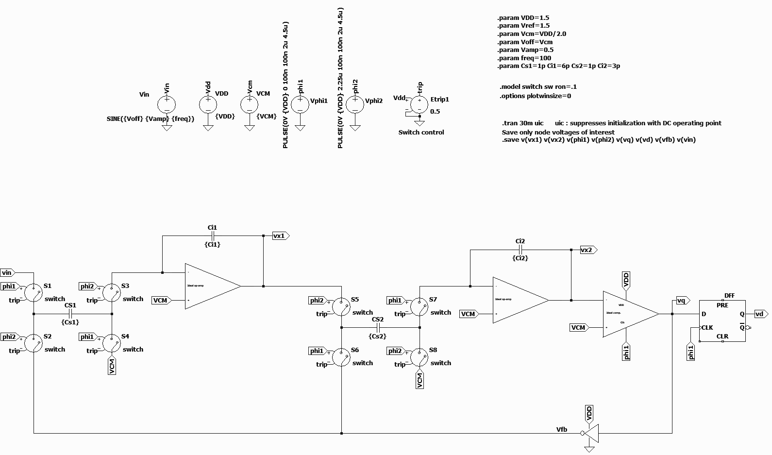 For this reason, we shall attempt to outline one of the most popular ways to convert data given the technology of our time. The approach is that of the Sigma-Delta converter. In the following we present our approach to designing such an ADC. This includes a theoretical analysis of the workings of \(\Sigma \Delta\) ADC’s, an exploration of it’s basic behavioural characteristics on system-level, deriving basic and idealized circuits to match the behaviour, and lastly a detailed design of the established circuit-level system using SPICE simulations within the xschem design environment, where concrete solutions on IC-level will be proposed.
