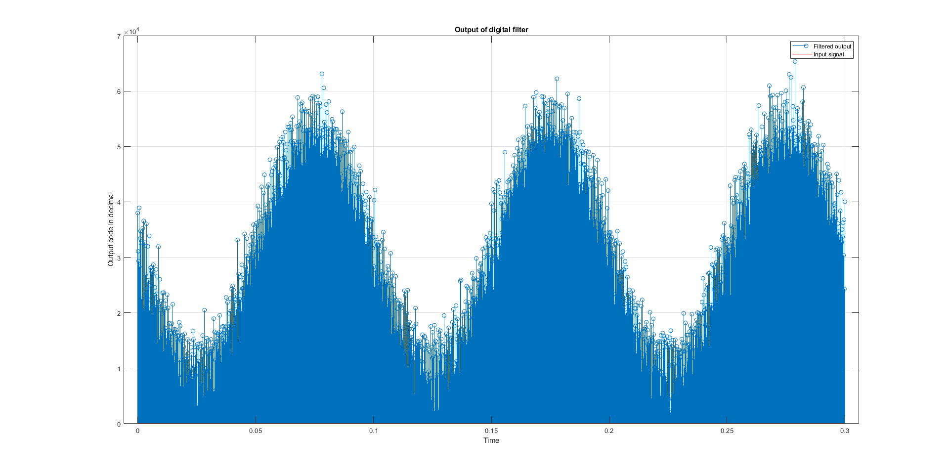 The resultig PWM can then lead to valid representations of our input samples by utilizing digital filtering. As mentioned previously, we average a bunch of samples from the PWM datastream, using triangularly weighted coefficients within the filter structure, to get proper individal samples. Those in turn are then down-sampled to the requiered Nyquist rate.