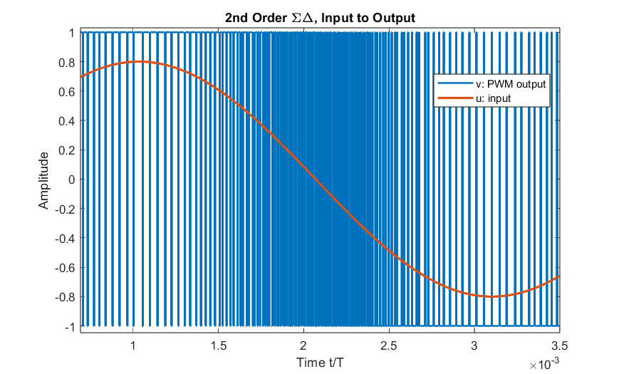 In case of a non-zero input, e.g. positive, the high-pulses of the PWM will be longer, due to the integrator being fed with a “lower magnitude” of \(\Delta\) during this time, therefore showing a slower change at the output, compared to the complementary case.