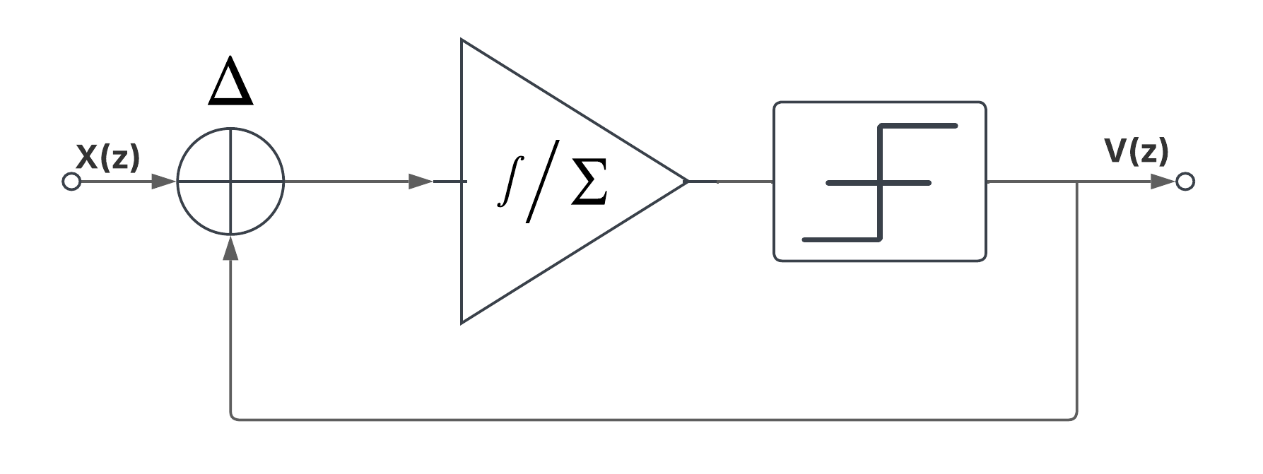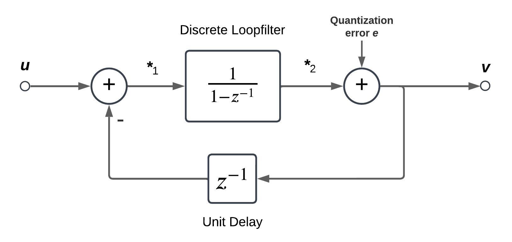 The system contains the so called “loopfilter”, the elemental block for the desired shaping process which is ultimately a delayed discrete integrator, indicating the impact of past samples on the current computation. We also include an additive error, representing the error in our output due to quantization.