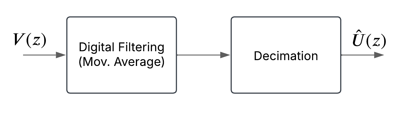 The digital filtering is then responsible to transform the discrete signal into an output from which the original input can be extracted. This typically involves lowpass filtering, specifically utilizing a “moving-average” filter. In case of \(\Delta\Sigma\) modulators, which utilize oversampling, it also includes down-sampling/ decimating. The resulting data rate then most often resembles something close to the Nyquist rate of the signal band.