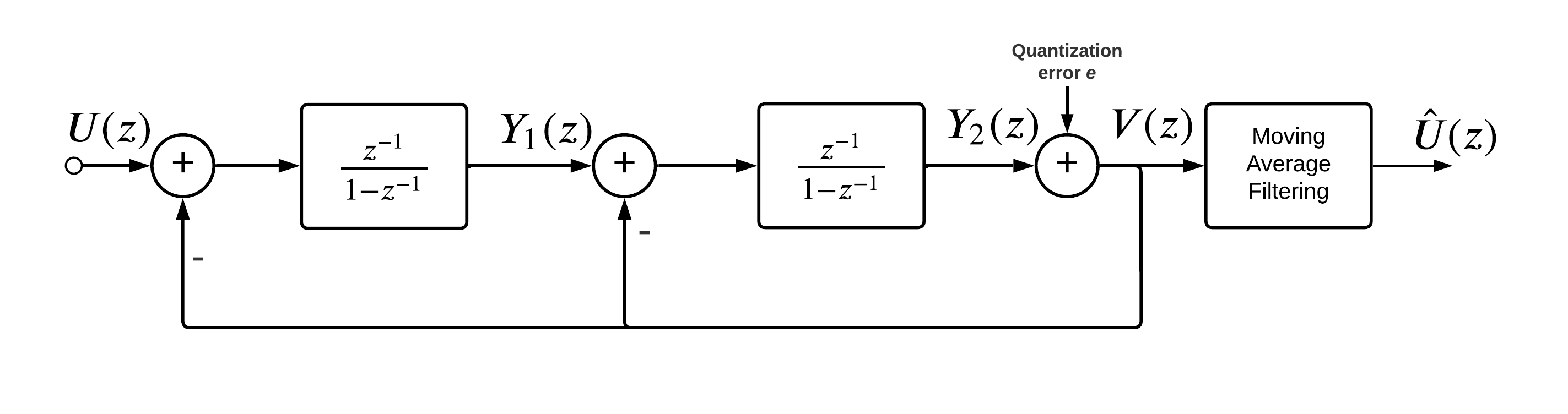 \('U(z)'\) is our input signal, in case of an ADC application it should therefore denote our “analog input”, which we will assume to be handled in a discrete fashion. \('V(z)'\) denotes the output of our feedback system, which should contain sufficient information about our original input, leading to \(\hat{U}(z)\) after the averaging- and decimation process mentioned earlier.